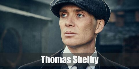 Thomas Shelby’s costume is a white dress shirt, a grey three-piece suit, black Oxfords, a bronze tie, a black trench coa...