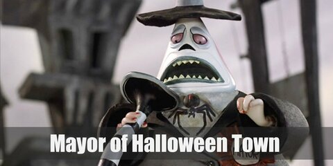 Mayor McCheese’s costume is a yellow button-down shirt, a maroon tailcoat, purple-striped pants, a purple sash, a chees...